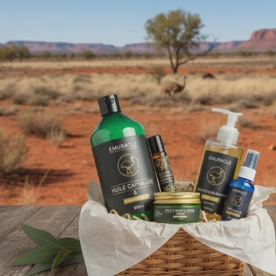 It's the gift that transforms care into a wellness ritual: the EMURACLE Gift Basket | The Australian Essential. Give more than just oil: the ancestral regeneration secret of the Outback, brought together in five flagship products based on 100% pure and ethically sourced emu oil.